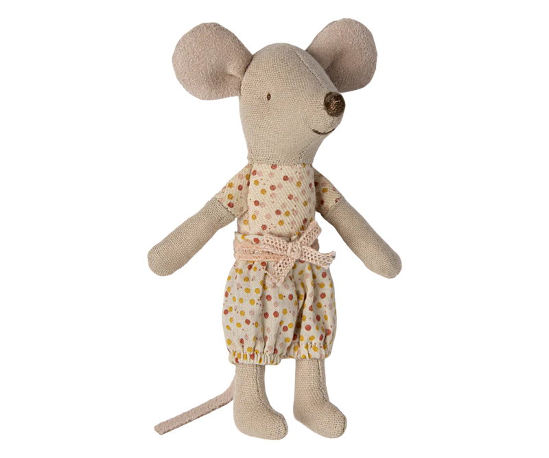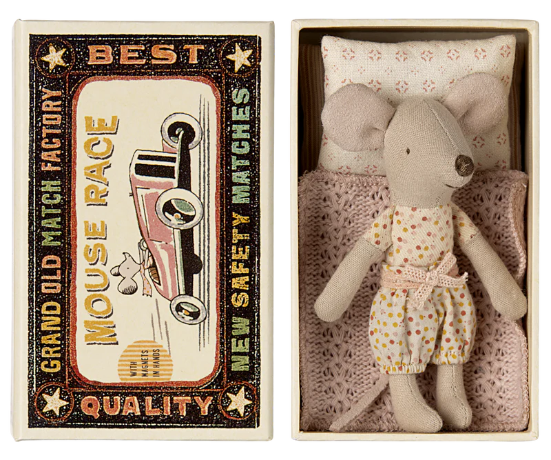 A Maileg favourite, this Little Sister Mouse comes tucked inside her very own matchbox bed. Dressed in cosy pyjamas, she rests on a soft blanket with a little pillow, ready for sweet dreams. When she wakes, she is all set for hours of play before curling back up in her box at bedtime.